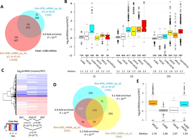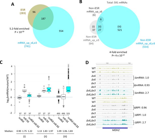(A) Venn diagram of overlap between the 741 mRNAs up-regulated in the scd6Δedc3Δ mutant vs. wild-type (WT) (mRNA_up_s6,e3) and the 283 induced ESR (iESR) mRNAs, indicating fold-enrichment and p value of overlap determined by the hypergeometric distribution. (B) Venn diagram of overlaps involving all 591 non-iESR mRNAs up-regulated in abundance by scd6Δ (6 Non-iESR mRNA_up_s6 transcripts), edc3Δ (64 mRNA_up_e3 transcripts), or scd6Δedc3Δ mutations (554 Non-iESR mRNA_up_s6,e3 transcripts). (C) Notched box-plot analyses of log2 changes in mRNA abundance (log2∆mRNA) determined by DESeq2 analysis between the indicated mutants vs. WT for mRNAs belonging to the specified sectors of the Venn diagram in (B). The numbers of mRNAs in each group for which data were obtained are indicated immediately above the x-axis; unlogged median values are indicated for each column at the bottom. (D) Gene browser image for MDH2 showing the mRNA (top 16 tracks) and ribosome-protected fragment (RPF) (bottom 16 tracks) reads measured by parallel RNA-Seq and ribosome profiling analyses for two biological replicates of WT and the indicated mutants with fold-changes in mRNA or RPFs between mutant and WT indicated to the right of each track. In panels A-D, results for the scd6∆, edc3∆, and scd6∆edc3∆ mutations, abbreviated as ∆s6, ∆e3, and ∆s6,∆e3, are shown in gray, white or light gray, and cyan, respectively.