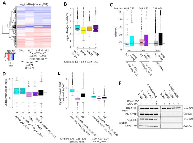 (A) Hierarchical clustering analysis of log2∆mRNA values conferred by the indicated mutations vs. wild-type (WT) for 741 of the 1052 mRNAs up- or down-regulated in scd6Δedc3Δ vs. WT cells for which RNA-Seq data was obtained in all five strains and with log2∆mRNA values >-5 and <5, conducted as in Figure 2C, showing Spearman coefficients and p values for indicated correlations. (B) Notched box-plots of log2∆mRNA between the indicated mutants vs. WT for the 554 non-iESR mRNAs up-regulated by scd6Δedc3Δ vs. WT (shown in Figure 1B). (C) Ratios of capped to total mRNA abundance in transcript numbers per million reads (TPMs) (Relative C/T) in WT or scd6∆edc3∆ cells plotted for all 5391 mRNAs, the 498 non-iESR mRNA_up_s6,e3, or 429 non-rESR mRNA_down_s6,e3 transcripts dysregulated by scd6Δedc3Δ vs. WT. (D) Notched box plots of the codon-protection index (CPI) for all mRNAs or for the sets of mRNAs up- or down-regulated by scd6Δedc3Δ vs. WT, including or excluding ESR transcripts, as indicated. (E) Notched box-plots showing log2 changes in absolute mRNA abundance from External RNA Controls Consortium (ERCC) spike-in normalized RNA-Seq (left) or absolute Rpb1 occupancies averaged over the coding sequences (CDSs) from S. pombe chromatin spike-in normalized Rpb1 ChIP-Seq (right) in scd6Δedc3Δ vs. WT cells for all mRNAs or the 554 or 526 non-ESR mRNAs up- or down-regulated, respectively, by scd6Δedc3Δ vs. WT. (F) Co-immunoprecipitation analysis of Dhh1-Dcp2 association in yeast cell extracts. Transformants of DHH1-TAP strains H5695 (WT), H5696 (edc3Δ), H5697 (scd6Δ), and H5698 (edc3Δ scd6Δ) and the parental untagged strains all harboring single-copy plasmid pAK133 expressing HA-tagged Dcp2 were cultured in SC-Ura at 30°C and whole cell extracts were incubated with IgG sepharose beads to purify Dhh1-TAP and associated proteins. Washed beads were eluted by boiling in SDS loading buffer and eluates and input extracts were resolved in parallel by SDS-PAGE and subjected to immunoblot analysis to detect the tagged proteins. Immune complexes were visualized with enhanced chemiluminescence.