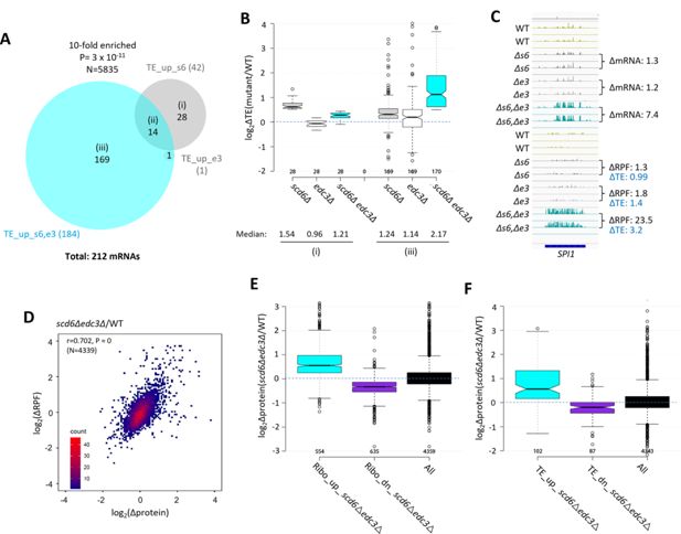 (A) Venn diagram of overlap between the 184 and 42 mRNAs in the TE_up groups identified in the scd6Δedc3Δ vs. wild-type (WT) or scd6Δ vs. WT comparisons, respectively. Fold-enrichment and p value from the hypergeometric distribution are indicated for the overlap. (B) Notched box-plots of log2∆TE values between the indicated mutants vs. WT for the mRNAs belonging to sectors (i) or (iii) of the diagram in (A). (C) Gene browser image for SPI1 presented as in Figure 1D, except also giving the TE changes for each mutant vs. WT on the lower right. (D) Density scatterplot of log2∆RPF values measured by ribosome profiling vs. log2∆protein values measured by TMT mass spectrometry (TMT-MS) for 4339 mRNAs for which data were obtained in both analyses, indicating the Pearson correlation coefficient (r) and p-value of the correlation. (E–F) Notched box-plots of log2∆protein values from TMT-MS analysis between the scd6Δedc3Δ mutant vs. WT for the 843 and 839 mRNAs belonging to the Ribo_up or Ribo_down groups, respectively (D), or the 184 and 152 TE_up or TE_down mRNA groups (E) determined for the scd6Δedc3Δ mutant vs. WT, or for all mRNAs, for which TMT-MS data was obtained.