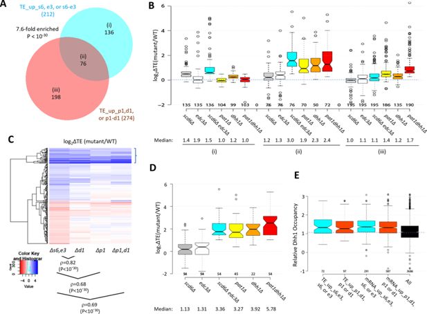 (A) Venn diagram of overlap between all 212 mRNAs translationally up-regulated by scd6Δ, edc3Δ, or scd6Δedc3Δ (defined in Figure 4) or all 274 mRNAs translationally up-regulated by dhh1Δ, pat1Δ, or pat1Δdhh1Δ vs. wild-type (WT) identified previously (Vijjamarri et al., 2023a). Fold-enrichment and p value from the hypergeometric distribution are indicated for the overlap. (B) Notched box plots of log2∆TE values between the indicated mutants vs. WT for the mRNAs belonging to the specified sectors of the diagram in (A). (C) Hierarchical clustering analysis of log2∆TE values conferred by the indicated mutations vs. WT for 222 of the 336 mRNAs translationally up- or down-regulated in scd6Δedc3Δ vs. WT cells for which RNA-Seq and Ribo-Seq data were obtained in all five strains and with log2∆TE values >-5 and <5 conducted as in Figure 2C, including the Spearman coefficients (ρ) and p values for the indicated correlations. (D) Notched box-plots of log2∆TE values between the indicated mutants vs. WT for the 54 mRNAs showing >2 fold translational efficiency (TE) increases conferred by both scd6Δedc3Δ and pat1Δdhh1Δ mutations vs. WT. (E) Relative Dhh1 occupancies from the Dhh1 RIP-seq experiments of Miller et al., 2018 for the 212 and 274 mRNAs identified as TE_up in the scd6Δ, edc3Δ, or scd6Δedc3Δ mutants, or the dhh1Δ, pat1Δ, or pat1Δdhh1Δ mutants, vs. WT, respectively (cols 1–2), or for the 591 and 1018 mRNAs identified as mRNA_up in either the scd6Δ, edc3Δ, or scd6Δedc3Δ mutants, or the dhh1Δ, pat1Δ, or pat1Δdhh1Δ mutants, vs. WT, respectively (cols. 3–4).