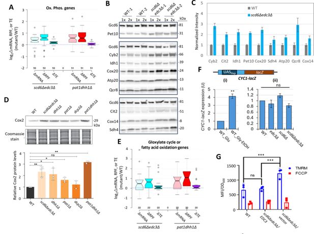 (A) Log2 changes in mRNA, ribosome-protected fragments (RPFs), or translational efficiency (TE) conferred by the indicated double mutations vs. wild-type (WT) for 53 nuclear genes encoding mitochondrial proteins involved directly in oxidative phosphorylation. (B–C) Western blot analysis of nine mitochondrial proteins and Gcd6 (examined as loading control) in WT and scd6Δedc3Δ strains, cultured in duplicate in YPD medium to OD600 of ~0.6–0.8. WCEs were extracted under denaturing conditions and aliquots corresponding to 1 X or 2 X amounts of WCE were loaded in successive lanes for the two biological replicate cultures. Immune complexes were visualized with enhanced chemiluminescence (B). Signals for each protein were quantified, normalized to the corresponding signals for Gcd6 in the same extract and expressed relative to the resulting values for WT cells. Mean values and standard errors are plotted (C). (D) Western blot analysis of Cox2 in strains of the indicated genotypes in cells cultured as in (B). Cox2 signal intensity was normalized to total Coomassie-stained protein and the resulting relative Cox2 protein levels from three biological replicates were averaged and plotted. P-values from student’s t-test indicated as **,<0.01; *,<0.05; ns, not significant. (E) Log2 changes in mRNA, RPFs, or TE conferred by the indicated double mutations vs. WT for 22 genes encoding enzymes of the glyoxylate cycle or fatty acid metabolism. (F) Expression of the CYC1-lacZ reporter on plasmid pLG265, lacking UAS1 and containing the optimized version of UAS2, UAS2UP1, in the WT strain grown on SC-Ura medium containing either 2% glucose or 3% glycerol/2% ethanol as carbon sources (i), or in WT and the indicated mutant strains on SC-Ura with 2% glucose (ii). β-galactosidase activity (nmoles of o-nitrophenyl-β-D-galactopyranoside (ONPG) cleaved per min per mg of total protein) was measured in whole cell extracts for three biological replicates of each strain and the mean values were normalized to the mean activity measured in WT grown with glucose as carbon source. **p-value <0.01 from student’s t-test; ns, not significant. (G) Measurements of mitochondrial membrane potential. WT cells or transformants of the scd6Δedc3Δ mutant containing the EDC3 plasmid pLfz614-7 or empty vector were cultured in SC-Ura to mid-log phase. Tetramethylrhodamine (TMRM) (500 nM) was added and incubated for 30 min before samples were collected and washed once with deionized water. ∆Ψm was determined by measuring TMRM fluorescence intensity using flow cytometry. Data are presented in arbitrary fluorescence intensity units per OD600. Two-way ANOVA was used for statistical analysis and data are given as mean values ± SD (n=3) (****p<0.0001).