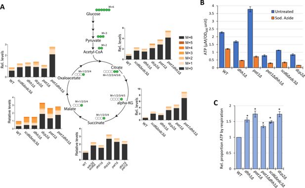 Three replicate cultures of each strain were grown in YP medium with 2% unlabeled glucose to OD600 of 0.6–0.7 and then shifted to YP with 1% unlabeled glucose and cultured for 20 min. 13C6-labeled glucose (1%) was then added and growth was continued for 8 min. Cells were collected, and metabolites were extracted, derivatized, and subjected to mass spectrometry as described previously, with the addition of additional masses for assessing the label incorporation into the specific labeled intermediates that were analyzed (Walvekar et al., 2018).