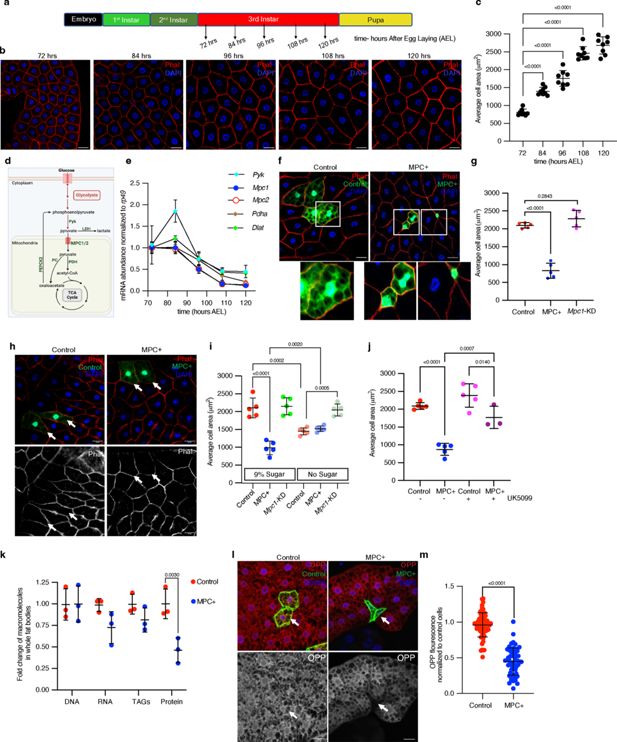 (a) A schematic representation of Drosophila developmental stages with specified time points (hours after egg laying (AEL) at 25°C) at which larvae were dissected to collect fat bodies. (b) Representative images of larval fat bodies at the indicated times (hours AEL) stained with rhodamine phalloidin to visualize cell membranes and DAPI to visualize DNA. The scale bar represents 25 μm. (c) Quantification of fat body cell area based on rhodamine phalloidin stained cell membranes at the indicated time points. Data are presented as mean ± standard deviation (s.d.) from six biological replicates, with each replicate averaging the size of 50 randomly selected cells from fat bodies dissected from five male larvae. (d) A schematic of pyruvate metabolism. In the cytoplasm, pyruvate is a product of glycolysis, synthesized by pyruvate kinase (Pyk) or from lactate via lactate dehydrogenase (LDH). Pyruvate is transported into mitochondria by the mitochondrial pyruvate carrier (MPC) complex. Within mitochondria, pyruvate is converted into acetyl-CoA by pyruvate dehydrogenase (PDH) or into oxaloacetate by pyruvate carboxylase (PC), both of which are substrates for the TCA cycle. PEPCK2 converts oxaloacetate into phosphoenolpyruvate. (e) Pyk, Mpc1, Mpc2, Pdha, and Dlat transcripts were quantified from larval fat bodies collected at the indicated times. (f) Representative confocal microscope images of phalloidin- and DAPI-stained fat bodies with flip-out Gal4 clones expressing MPC1-P2A-MPC2 (MPC+), marked with GFP at 120 hr AEL. The images at the bottom show magnified insets of GFP-positive cells in control and MPC-expressing clones. (g) Quantification of GFP-positive clonal cell area with the indicated genetic manipulations—control, MPC+, and Mpc1-KD. Data are presented as mean ± s.d. from six biological replicates, with each set averaging the size of 20 clonal cells from fat bodies collected from five male larvae. (h) Images showing control and MPC+ clones from larvae fed on no sugar diet. (i) Quantification of the area of control, MPC+ and Mpc1-KD fat body clonal cells from larvae fed on a diet containing either 9% sugar or no sugar. (j) Quantification of the area of MPC+ fat body clonal cells from larvae fed a diet supplemented with or without 20 μM UK5099. (k) Fold change of the abundances of the indicated macromolecules in fat bodies expressing MPC (MPC+) in all fat body cells using CG-Gal4. The abundance of each individual macromolecule is normalized to that of the respective macromolecular abundance in GFP-expressing, control fat bodies. Data are represented as mean ± s.d. from three biological replicates with fat bodies collected from 10 larvae at 120 hr AEL. (l) Representative images of fat body clones stained with O-propargyl-puromycin (OPP, 20 μM for 30 min), showing control and MPC expressing GFP-positive cells. The top panels show GFP-positive clones and OPP staining in red, while the bottom panels show respective OPP channel. Arrows indicate cells with the specified genetic manipulation. The scale bar represents 20 μm. (m) Quantification of OPP fluorescence intensity of control or MPC+ fat body cells compared to neighboring non-clonal cells. Data are presented as mean ± s.d. from six biological replicates, with each set averaging the size of 20 clonal cells from fat bodies collected from five male larvae. Unpaired t-tests or one-way ANOVA tests were performed to evaluate the statistical significance of the data, with p-values mentioned in the graphs where significance was noted. Panel d was created with BioRender.com.