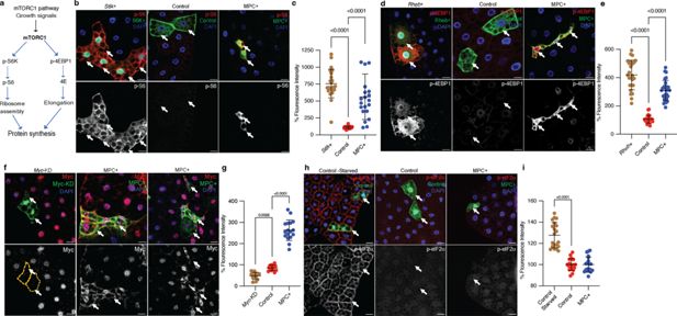 (a) Schematic of the mTORC1 pathway. The mTORC1 pathway is activated by pro-growth signals such as insulin, leading to the phosphorylation of S6 kinase (S6K) and 4EBP. S6K phosphorylates ribosomal protein S6, while 4EBP phosphorylation inactivates 4EBP and releases elongation factor eIF4E. These events increase ribosomal assembly and elongation rates, thereby enhancing protein synthesis. (b) Representative images of fat body clones with S6k overexpression, control clones, and MPC+ clones, stained for phosphorylated S6 (p-S6) in red (top panels) and white (bottom panels). Arrows indicate clonal cells with the specified genetic manipulation. The scale bar represents 20 μm. (c) Quantification of total p-S6 fluorescence intensity in GFP-positive cells compared to neighboring GFP-negative cells in MPC+ versus control clones. Data are presented as mean ± s.d. with statistical significance as scored with one-way ANOVA test. (d) Representative images of fat body clones with Rheb over-expression, control clones, and MPC+ clones stained for phosphorylated 4EBP (p-4EBP) in red (top panels) and white (bottom panels). Arrows indicate clonal cells with the specified genetic manipulation. The scale bar represents 20 μm. (e) Quantification of total p-4EBP fluorescence intensity in MPC+ versus control clones with statistical significance as scored with One-way ANOVA test. (f) Representative images of fat body clones with Myc knockdown, control clones, and MPC+ clones stained for Myc protein in red (top panels) and white (bottom panels). Arrows indicate clonal cells with the specified genetic manipulation. The scale bar represents 20 μm. (g) Quantification of total Myc fluorescence intensity in MPC+ versus control clones with statistical significance as scored with one-way ANOVA test. (h) Representative images of fat body clones from starved wild type, control clones, and MPC+ clones, stained for phosphorylated eIF2α (p-eIF2α) in red (top panels) and white (bottom panels). Arrows indicate clonal cells with the specified genetic manipulation. The scale bar represents 20 μm. (i) Quantification of total p-eIF2α fluorescence intensity in MPC+ versus control clones with statistical significance as scored with one-way ANOVA test. Data are presented as mean ± s.d. One-way ANOVA tests were performed to evaluate the statistical significance of the data, with p-values noted in the graph if significance was observed.