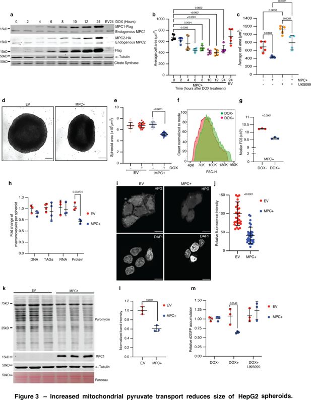 Increased mitochondrial pyruvate transport reduces size of HepG2 spheroids.
