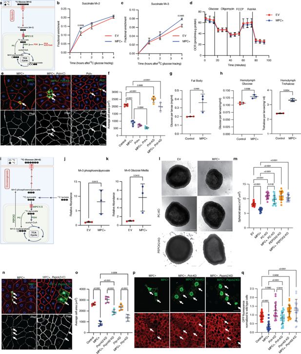 (a) Schematic illustration of the 13C-glucose tracing strategy used to measure the activity of pyruvate dehydrogenase (PDH) and pyruvate carboxylase (PC). TCA metabolites labeled with two heavy carbons (13C or M+2 TCA pool) result from PDH activity, whereas M+3 TCA metabolites result from PC activity. PDH is inhibited by PDK-mediated phosphorylation. DCA and AZD7545 are inhibitors of PDK. (b) Fractional enrichment of M+2 succinate in empty vector (EV; red) and MPC-expressing (MPC+; blue) HepG2 cells at the indicated times after 13C-glucose tracing. MPC expression was induced for 24 hr by treatment with 1 µg/ml doxycycline and media was changed to 12C-glucose. The change in M+2 succinate is significant (by two-way ANOVA test) at 1 hr after 13C glucose incubation. (c) Fractional enrichment of M+3 succinate in EV (red) and MPC+ (blue) HepG2 at the indicated times after 13C-glucose tracing. MPC expression was induced for 24 hr by treatment with 1 μg/ml doxycycline. The change in M+3 succinate is significant (by two-way ANOVA test) at 4 hr after 13C-glucose incubation. (d) Rate of oxygen consumption (OCR) in EV and MPC+ HepG2 cells. (e) Representative images of phalloidin- and DAPI-stained fat body cells. Arrows indicate GFP-positive clones with MPC expression (MPC+), Pcb knockdown with MPC expression (MPC+, Pcb-KD), or Pcb overexpression (Pcb+). The scale bar represents 20 µm. (f) Quantification of the area of GFP-positive clones with control, MPC+, Pcb over-expression (Pcb+), Pcb and MPC co-expression (MPC+, Pcb+), Pcb knockdown (Pcb-KD), and Pcb knockdown with MPC expression (MPC+, Pcb-KD) shown as mean ± s.d. of five biological replicates, with each group representing the analysis of 20 the indicated clonal cells. Concentration of glucose in the fat body (g) and concentration of glucose and trehalose in hemolymph (h) of larva with fat body-specific expression MPC or control. Data is presented as mean ± s.d. of three biological replicates analyzed by unpaired t-tests. (i) Schematic illustration of the strategy to analyze gluconeogenesis from 13C-lactate. Cells convert 13C-lactate into 13C-pyruvate, which is transported into mitochondria by the MPC. PC converts 13C-pyruvate (M+3) into oxaloacetate (M+3). PEPCK2 converts oxaloacetate (M+3) into phosphoenolpyruvate (M+3), which is converted into M+6 glucose and excreted from cells. (j) Relative abundances of M+3 phosphoenolpyruvate (PEP) in EV and MPC+ HepG2 cells and (k) M+6 glucose in their respective media following treatment with 20 mM 13C-lactate for 4 hr. Data is presented as mean ± s.d. of three biological replicates, each with an average of three technical replicates. (l) Representative brightfield images of EV, MPC+, and PC knockout (KO) or PEPCK2 KO with or without MPC expression HepG2 spheroids. The scale bar represents 200 µm. (m) Quantification of spheroid area is presented as mean ± s.d. of 30 technical replicates. (n) Representative images of phalloidin- and DAPI-stained fat body cells. Arrows indicate GFP-positive clones with MPC expression (MPC+), and Pepck2 knockdown with MPC expression (MPC+, Pepck2-KD). The scale bar represents 20 µm. (o) Quantification of the area of GFP-positive clones with MPC+, Pepck2 knockdown (Pepck2-KD), Pepck2 knockdown with MPC+ (MPC+, Pepck2-KD), Fbp knockdown (Fbp-KD), Fbp knockdown with MPC+ (MPC+, Fbp-KD). Data is presented as mean ± s.d. of five biological replicates, with each group analyzing 20 clonal cells of the mentioned genetic manipulations. (p) Representative images of fat body clones stained with OPP (red). Arrows indicate GFP-positive clones with MPC expression (MPC+), Pcb knockdown with MPC expression (MPC+, Pcb-KD), or Pepck2 knockdown with MPC expression (MPC+, Pepck2-KD). The scale bar represents 20 µm. (q) Quantification of OPP intensity in the indicated clones compared with adjacent wild-type cells. Data is presented as mean ± s.d. Unpaired t-tests, one-way ANOVA tests, or two-way ANOVA tests were performed to evaluate the statistical significance of the data, with p-values mentioned in the graph if significance is noted. Panel a was created with BioRender.com. Panel i was created with BioRender.com.