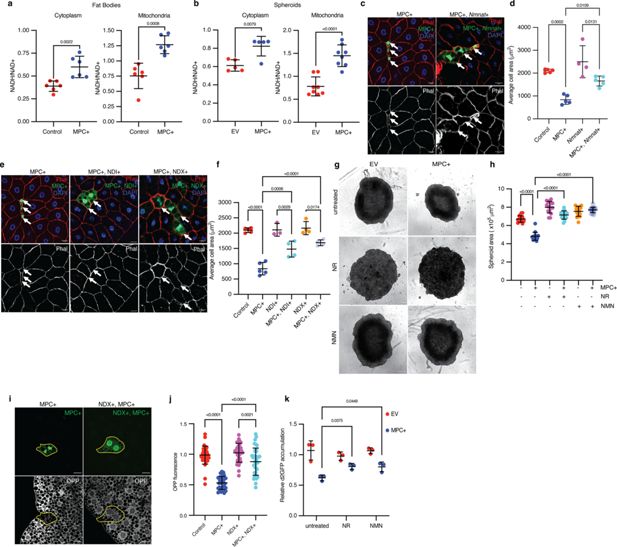 (a) NADH/NAD+ ratios from the cytoplasmic and mitochondrial fractions of control and MPC-expressing (MPC+) fat bodies. Data is presented as mean ± s.d. of six biological replicates. (b) NADH/NAD+ ratios from the cytoplasmic and mitochondrial fractions of empty vector (EV) and MPC-expressing (MPC+) HepG2 spheroids. Data is presented as mean ± s.d. of six biological replicates. (c) Representative images of phalloidin- and DAPI-stained fat bodies. Arrows indicate GFP-positive cells with either MPC+ or MPC and Nmnat co-expression (MPC+, Nmnat+). The scale bar represents 20 µm. (d) Quantification of the areas of GFP-positive cells with control, MPC+, Nmnat overexpression (Nmnat+), MPC and Nmnat co-expression (MPC+, Nmnat+). Data is presented as mean ± s.d. of five biological replicates, with 20 clonal cells analyzed for each of the indicated genetic manipulations. (e) Representative images of Phalloidin and DAPI-stained fat body tissues. Arrows indicate GFP-positive cells showing MPC expression (MPC+); NDI and MPC expression (MPC+, NDI+); and NDX and MPC expression (MPC+, NDX+). The scale bar represents 20 µm. (f) Quantification of the area of GFP-positive cells with control, MPC+, NDI expression (NDI+), NDI and MPC expression (MPC+, NDI+), NDX expression (NDX+), NDX and MPC co-expression (MPC+, NDX+). Data is presented as mean ± s.d. of five biological replicates, with 20 clonal cells analyzed for each of the indicated genetic manipulations. (g) Representative bright field images of EV or MPC+HepG2 spheroids cultured with NAD+ supplements (100 nM nicotinamide riboside or 1 µM NMN) as indicated. The scale bar represents 200 µm. (h) Quantification of spheroid area is presented as mean ± s.d. of 30 technical replicates. (i) Representative images MPC+ or MPC+, NDI+ GFP-positive clones and of fat body cells stained with OPP (bottom). Clonal cells are mapped with dotted lines. The scale bar represents 20 µm. (j) Fold change in OPP intensity of 35 GFP-positive cells compared with adjacent wild-type cells. Data is presented as mean ± s.d. (k) Relative accumulation of destabilized GFP (d2GFP) in spheroids of EV or MPC+ HepG2 cells treated with NAD+ supplements (100 nM nicotinamide riboside or 1 µM NMN) as indicated. Unpaired t-tests, one-way ANOVA tests, or two-way ANOVA tests were performed to assess the statistical significance of the data, with p-values indicated in the graph where significance was observed.