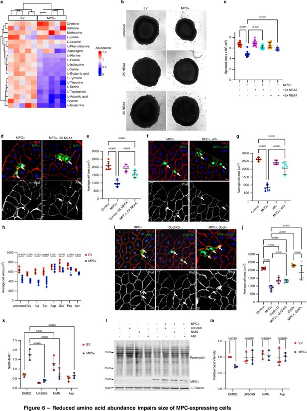 (a) A heatmap of the abundances of amino acids in empty vector (EV) and MPC expressing (MPC+) HepG2 cells cultured under standard conditions. Color codes indicate relative abundances for each amino acid: blue (low), green (similar), and yellow (high). (b) Representative bright field images of EV or MPC+ HepG2 spheroids cultured with 2x or 3x the recommended concentration of non-essential amino acids cocktail (NEAA). The scale bar represents 200 µm. (c) Quantification of spheroid areas from EV and MPC+ HepG2 spheroids cultured with 2x or 3x NEAA. Data is presented as mean ± s.d. of 30 technical replicates. (d) Representative images of phalloidin- and DAPI-stained fat body cells from animals fed a standard diet or a diet supplemented with 5x NEAA. Arrows indicate GFP-positive clones with MPC expression (MPC+). The scale bar represents 20 µm. (e) Quantification of the area of MPC+ fat body clonal cells. Data is presented as mean ± s.d. of five biological replicates, with each data point representing the average size of 20 clones collected from five male larvae. (f) Representative images of phalloidin- and DAPI-stained fat body cells. Arrows indicate GFP-positive MPC+ clones and MPC+ and slimfast over-expression (MPC+, Slif+). The scale bar represents 20 µm. (g) Quantification of the area of GFP-positive clones with control, MPC expression, Slimfast overexpression (Slif+) and MPC+ clones with Slimfast overexpression (MPC+, Slif+). Data presented as mean ± s.d. of five biological replicates, with each 20 clonal cells analyzed for each of the indicated genetic manipulations. (h) Quantification of the cell areas of EV or MPC+ HepG2 cells cultured under standard conditions or with excess of the indicated amino acid—10 mM glycine, 5 mM alanine, 5 mM serine, 5 mM asparagine, 5 mM aspartic acid, 5 mM glutamic acid, or 5 mM proline. Data is presented as mean ± s.d. of five biological replicates. (i) Representative images of phalloidin- and DAPI-stained fat body cells. Arrows indicated GFP-positive cells with MPC expression (MPC+), Got2 knockdown (Got2 KD), and Got2 overexpression with MPC expression (MPC+, Got2+). (j) Quantification of the area of GFP-positive clones with control, MPC expression (MPC+), Got2 knockdown (Got2-KD), Got2 knockdown with MPC expression (MPC+, Got2-KD), Got2 overexpression (Got2+), and Got2 overexpression with MPC expression (MPC+, Got2+). Data is presented as mean ± s.d. of five biological replicates, with each 20 clonal cells analyzed for each of the specified genetic manipulations. (k) NADH/NAD+ ratio in cells treated with 10 µM UK5099, 1 µM NMN, or 5 mM aspartate. Data is presented as mean ± s.d. of three biological replicates. (l) Western blot analysis of puromycin-labeled (20 µg/ml puromycin for 30 min) nascent protein in EV or MPC+ HepG2 cells cultured with 10 µM UK5099, 1 µM NMN, or 5 mM aspartate. (m) Quantification of intensities of puromycin labeling in EV and MPC+ cell lysates. Unpaired t-tests and one-way ANOVA tests were performed to evaluate the statistical significance of the data, and p-values are noted in the graph if significance is observed.