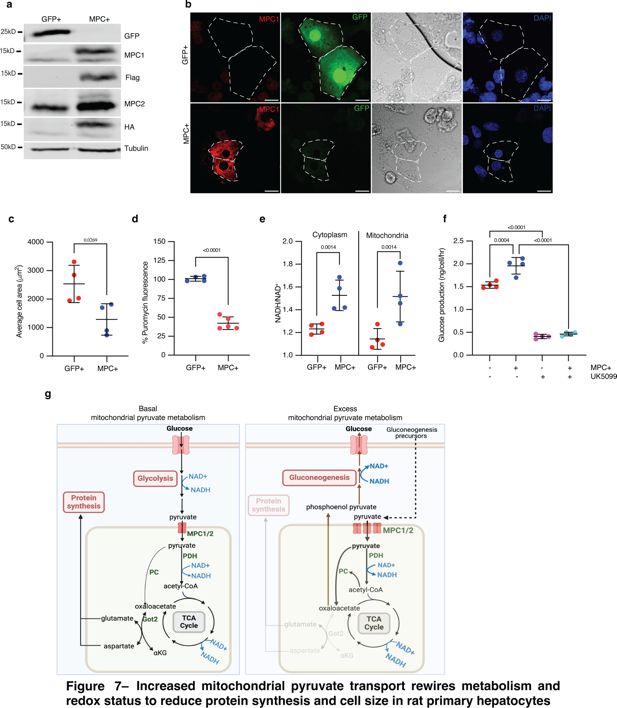 The fate of pyruvate, which is primarily generated from glucose via glycolysis in the cytoplasm, is a critical node that can determine the balance between energetic and biosynthetic metabolism (Baker and Rutter, 2023; Yiew and Finck, 2022). In most differentiated cells, the majority of pyruvate is transported into the mitochondria via the mitochondrial pyruvate carrier (MPC) complex, a heterodimer composed of MPC1 and MPC2 proteins (Bricker et al., 2012; Herzig et al., 2012). Once in the mitochondria, pyruvate is converted to acetyl-CoA by the pyruvate dehydrogenase complex (PDH), fueling the tricarboxylic acid (TCA) cycle and supporting efficient ATP production. In cancer, stem, and other proliferative cells, more pyruvate is converted to lactate and exported from the cell, a process that regenerates NAD+, a cofactor necessary for glycolytic flux (Baker and Rutter, 2023; Lunt and Vander Heiden, 2011; Zhu and Thompson, 2019). In some specialized cells, including hepatocytes, pyruvate is imported into mitochondria but converted to oxaloacetate, which can feed the TCA cycle but also serves as a precursor for glucose production via gluconeogenesis (Holeček, 2023b; Jitrapakdee et al., 2008). We and others have demonstrated that these alternative fates of pyruvate—energy generation, cell proliferation, or glucose production—differentially impact the metabolic and fate decisions of multiple cell types in varying contexts (Bensard et al., 2020; Cluntun et al., 2021; Wei et al., 2022; Yiew and Finck, 2022). Loss of MPC function, which shifts pyruvate metabolism toward lactate production and thus expedites glycolysis and the production of biosynthetic precursors, has been shown to increase cell proliferation in mouse and Drosophila intestinal stem cells as well as in various tumors (Bensard et al., 2020; Schell et al., 2017; Zangari et al., 2020). MPC expression is also reduced in human and mouse models of heart failure, and genetic deletion of the MPC in cardiomyocytes is sufficient to induce hypertrophy and heart failure (Cluntun et al., 2021; Fernandez-Caggiano et al., 2020; McCommis et al., 2020; Zhang et al., 2020). Conversely, MPC overactivation or overexpression restricts intestinal stem cell proliferation and limits the growth of cardiomyocytes under hypertrophic stimuli, with excess mitochondrial pyruvate fueling the TCA cycle (Bensard et al., 2020; Schell et al., 2014; Schell et al., 2017). These observations suggest that mitochondrial pyruvate metabolism is central to cell proliferation as well as the size and specialized functions of post-mitotic cells.