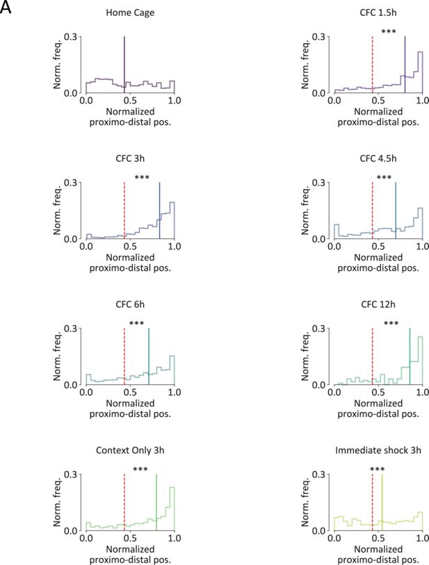 (A) Normalized proximodistal (x) and superficial-to-deep (y) frequency distribution of the position of CA3 FLEN+ neurons in all behavioral groups. Black dashed lines indicate each group’s median value, while the red dashed line represents the home cage group’s median value. Each plot includes the scattered x–y position of FLEN+ cells within the pyramidal layer, and the frequency distribution along the proximodistal (top) and superficial-to-deep (right) axis. Statistical significance: ***p<0.001.