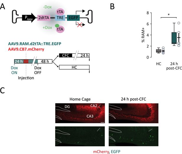 (A) RAM construct outline and expression mechanism. Top panel: Dox administration prevents binding of tTA protein to the TRE promoter, whereas Dox deprivation allows downstream EGFP transcription. Bottom panel: scheme for in vivo experiments using the RAM system. Dox-fed mice are bilaterally injected in CA3 with viral constructs for RAM and the infection marker AAV-CB7-mCherry. The diet is switched to regular food chow 48 hr prior to the contextual fear conditioning (CFC). Then, mice undergo CFC and sections are collected (downward arrows) 24 hr later and compared to untrained mice that never left their home cage. (B) Percentage of RAM+ CA3 neurons over the total number of mCherry+ neurons in HC and 24 hr post-CFC. (C) Representative sections of CFC-trained mice compared to HC mice. Dashed lines outline the dentate gyrus (DG) cellular layer, while the dashed segment indicates the separation between CA3 and CA2. Scale bar = 100 µm. Statistical signficance: *p<0.05.