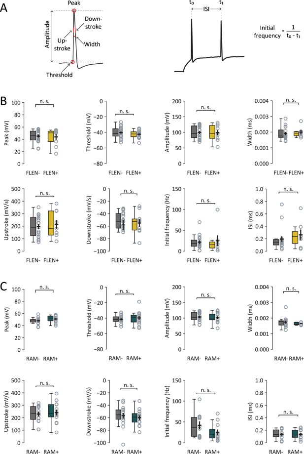 (A) Left panel: overview of analyzed action potential features. Right panel: initial frequency calculation. Summary of analyzed action potential properties in FLEN+ vs. FLEN− (B) and RAM+ vs. RAM− (C).