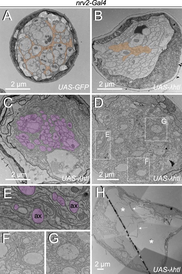 Electron microscopic images of segmental nerves from wandering third instar larvae. (A) Nerve of a control larva expressing GFP in wrapping glia sectioned 150 µm posterior to the ventral nerve cord. Normally differentiated wrapping glia can be seen. (B–H) Nerves of larvae expressing activated Heartless in wrapping glia [nrv2-Gal4; UAS-λhtl] sectioned at the positions indicated in Figure 1C. (B) Note the poorly differentiated wrapping glial cells distant from the nerve bulge. (C,D) At the beginning of the nerve bulge, excessive differentiation of wrapping glial cell processes starts to be detected that do not always grow around axons (magenta). (E–G) Higher magnifications of the boxed areas in (D). Note the formation of wrapping glial cell processes that do not contact axons (ax, magenta) but rather contact glial cell processes. (H) In the central area of the nerve bulge, liquid-filled vacuolar structures (asterisks) can be detected. Thin wrapping glial cell processes (arrows) span the bulged area.
