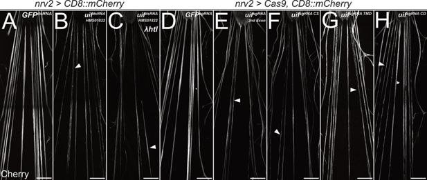 Confocal images of third instar larval filet preparations, stained for CD8::mCherry expression. The segmental nerves posterior to the ventral nerve cord are shown. (A) Filet preparation of a control third instar larva. (B) uif knockdown in wrapping glial cells [nrv2-Gal4; UAS-uifdsRNA-HMS01822] impairs their development, which (C) cannot be rescued by co-expression of activated Htl. (D–H) Ubiquitous expression of (D) mock control GFPsgRNA, (E) uifsgRNA 2nd Exon, (F) uifsgRNA CS, (G) uifsgRNA TMD, or (H) uifsgRNA CD in Cas9-expressing larvae. All uif sgRNAs disrupt wrapping glial cell development, and wrapping glia appear thin and fragmented (arrowheads). n=5 larvae for all genotypes. Scale bars 100 µm.