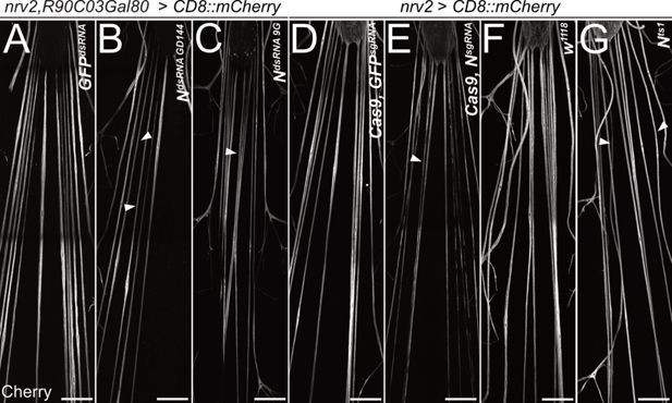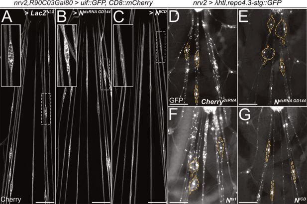 Filet preparations of wandering third instar larvae stained for CD8::mCherry expression. The segmental nerves just posterior to the ventral nerve cord are shown. (A) Control larvae expressing the mock control GFPdsRNA in wrapping glial cells specifically [nrv2-Gal4; R90C03-Gal80]. Upon expression of dsRNA targeting Notch mRNAs (B) NGD144, (C) N9G. (D) Control larva expressing sgRNA directed against the GFP open reading frame in [nrv2-Gal4; UAS-Cas9]. (E) Conditional knockout of Notch leads to dramatically altered morphology of wrapping glial cells. (F) Control larva cultured at the same temperature regime as the Nts1 larva shown in (G). Wrapping glial cells appear smaller compared to the control. Scale bars 100 µm.