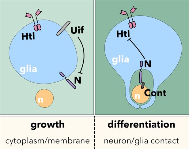 Wrapping glial development is initiated by the activation of RTK, including the FGF-receptor Heartless (Htl). In perineurial glia, RTK activity will trigger cell division, whereas in the remaining glial cells, RTK activity is used to support cell growth to subsequently allow differentiation (Avet-Rochex et al., 2012; Avet-Rochex et al., 2014; Franzdóttir et al., 2009; Read et al., 2009; Stork et al., 2014; Witte et al., 2009; Wu et al., 2017). This dual function of RTK signaling in controlling either proliferation, cell growth, or differentiation is accompanied by a switch in activating ligands, as well as the expression of additional regulator proteins that modulate RTK signaling strength (Franzdóttir et al., 2009; Ohm et al., 2024; Sieglitz et al., 2013).