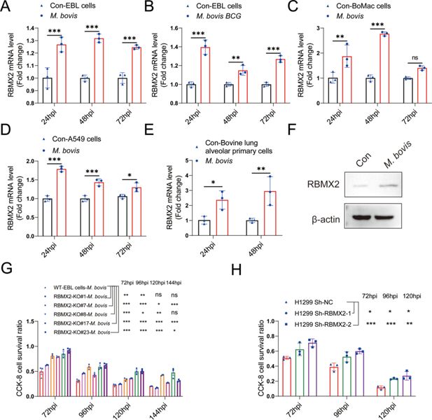 The expression of RBMX2 in EBL cells infected by (A) M. bovis and (B) M. bovis Bacillus Calmette–Guérin (BCG) was analyzed by real-time quantitative polymerase chain reaction (RT-qPCR). Data were represented by fold expression relative to uninfected cells. (C–E) The expression of RBMX2 mRNA in (E) BoMac cells, (F) A549 cells, and (G) bovine lung alveolar primary cells infected by M. bovis was analyzed via RT-qPCR. Data were represented by fold expression relative to uninfected cells. (F) The expression of RBMX2 in EBL cells infected by M. bovis was analyzed by WB. Data were represented by fold expression relative to uninfected cells. (G) Detection of the ability of different RBMX2 knockout site monoclonal EBL cells against M. bovis infection by CCK-8 assay. Data were represented by the absorbance value relative to WT EBL cells after M. bovis infection. (H) Detection of the ability of RBMX2 slicing H1299 cells against M. bovis infection by CCK-8 assay. Data were represented by the absorbance value relative to Sh-NC H1299 cells after M. bovis infection. One- and two-way ANOVA were used to determine the statistical significance of differences between different groups. Ns presents no significance; *p < 0.05, **p < 0.01, and ***p < 0.001 indicate statistically significant differences. Data were representative of at least three independent experiments.
