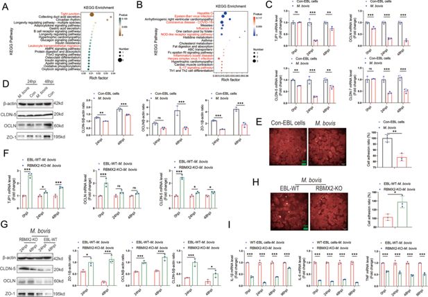 Kyoto Encyclopedia of Genes and Genomes (KEGG) analysis was conducted to identify the (A) downregulated and (B) upregulated pathways among the enriched genes after M. bovis infection of WT EBL cells. Data were relative to WT EBL cells without M. bovis infection. The expression of epithelial cells tight junction-related (C) mRNAs (TJP1, CLDN-5, CLDN-7, and OCLN) and (D) proteins (ZO-1, CLDN-5, and OCLN) were assessed after M. bovis infection of WT EBL cells via real-time quantitative polymerase chain reaction (RT-qPCR) and WB. Data were relative to WT EBL cells without M. bovis infection. (E) Cell adhesion ratio was evaluated via cell adhesion assay after WT EBL cells were infected with M. bovis using high-content imaging. Data were relative to WT EBL cells without M. bovis infection. Scale bar: 20 μm. (F, G) The expression of epithelial tight junction-related (F) mRNAs (TJP1, CLDN-5, and OCLN) and (G) proteins (ZO-1, CLDN-5, and OCLN) in RBMX2 knockout EBL cells after M. bovis infection through real-time quantitative polymerase chain reaction (RT-qPCR) and WB. Data were relative to WT EBL cells with M. bovis infection. (H) Cell adhesion assay was conducted to assess the cell adhesion ratio of RBMX2 knockout EBL cells after infection with M. bovis. Data were relative to WT EBL cells with M. bovis infection. Scale bar: 20 μm. (I) Expression of inflammatory factors-related factors (IL-6, IL-1β, and TNF) was assessed after RBMX2 knockout EBL cells infected by M. bovis. Data were relative to WT EBL cells with M. bovis infection. T-test and two-way ANOVA were used to determine the statistical significance of differences between different groups. Ns presents no significance; *p < 0.05, **p < 0.01, and ***p < 0.001 indicate statistically significant differences. Data were representative of at least three independent experiments.