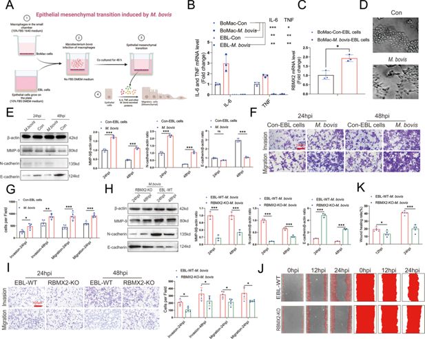 Despite these findings, the role of RBMX2 in M. bovis infection and its potential involvement in EMT regulation remains largely unexplored. Based on our preliminary data, we hypothesize that RBMX2 promotes M. bovis adhesion and invasion by modulating host cell properties and further facilitates EMT through activation of the p65/MMP-9 signaling pathway. This study aims to elucidate the molecular mechanisms by which RBMX2 contributes to M. bovis infection and its potential role in infection-associated EMT, thereby providing novel insights into the intersection of TB and lung cancer. These findings may highlight RBMX2 as a promising therapeutic target for TB and TB-related malignancies.