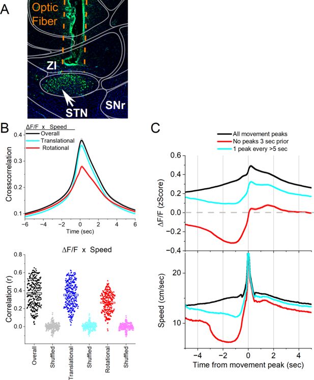In freely moving mice, we conducted continuous measurements of calcium fluorescence (ΔF/F) and spontaneous movement while mice explored an arena. Cross-correlations were computed between movement and STN activation to relate these continuous variables (Figure 1B upper). Overall movement was strongly correlated with STN neuron activation. When the movement was dissociated into rotational and translational components, the cross-correlation predominantly involved the translational movement. A linear fit between the movement and ΔF/F (integrating over a 200 ms window) revealed a strong linear positive correlation between the STN activation and translational or rotational movement (Figure 1B lower). These relationships were absent when one variable in the pair was shuffled (Figure 1B, lower).