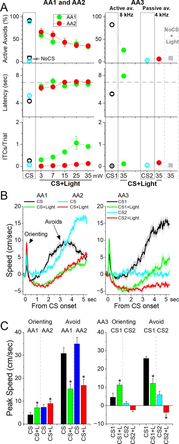 During optogenetic experiments that involve avoidance procedures, we compared different trial types: CS and CS+Light. CS trials were standard avoidance trials specific to each procedure, without optogenetic stimulation. CS+Light trials were identical to CS trials, except that optogenetic light was delivered simultaneously with the CS and the US during the avoid and escape intervals. To perform within-group repeated measures (RM) comparisons, the different trial types for a procedure were delivered randomly within the same session. In addition, the trials were compared between different groups, including No Opsin mice that did not express opsins but were subjected to the same trials, including light delivery.