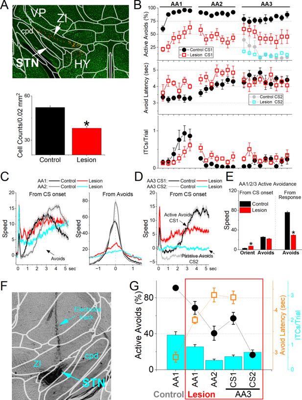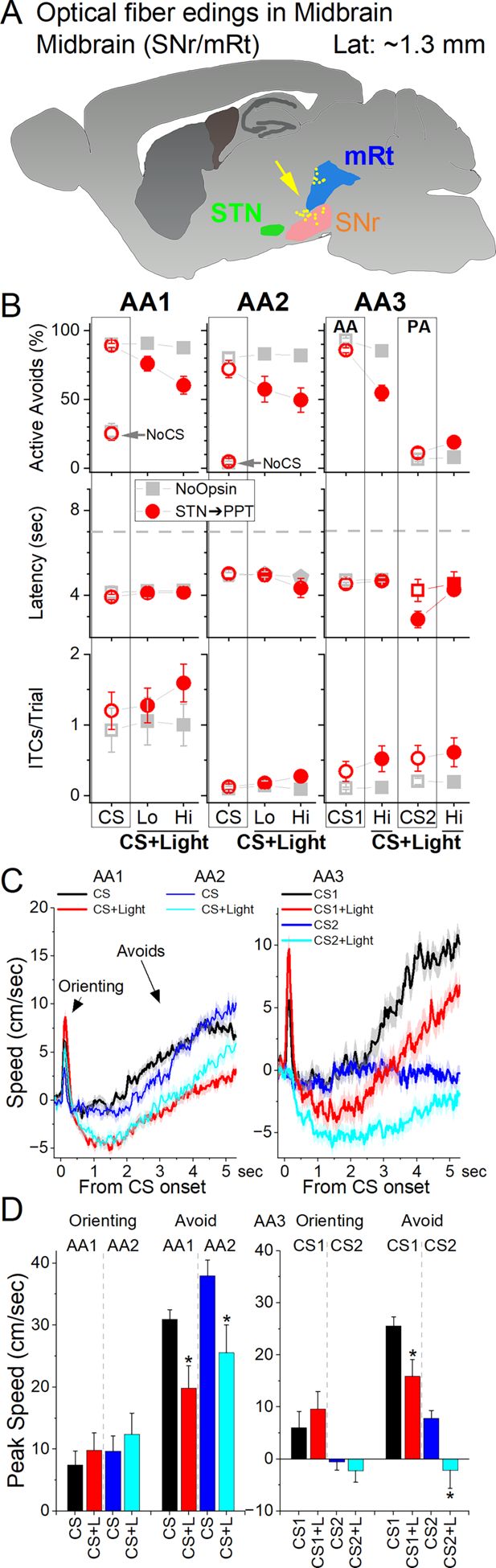 Our results using viral and electrolytic lesions, as well as optogenetic inhibition of STN neurons, show that signaled active avoidance is virtually abolished, and this deficit is reproduced when we selectively inhibit STN fibers in the midbrain. Inhibition of STN projections in either the SNr or mRt eliminates cued avoidance responses. Critically, mice continue to escape during US presentations after lesions or during photoinhibition, indicating that basic motor capabilities and rapid defensive actions remain preserved. These findings argue against the idea that the STN’s role in avoidance arises from a nonspecific suppression or facilitation of motor tone, even if the STN also contributes to general movement control. Instead, the loss-of-function data demonstrate that STN output is required specifically for generating cued actions that depend on interpreting sensory information and applying learned contingencies to decide when to act. Thus, while STN activity can modulate movement parameters, its essential role in cued avoidance may reflect a selective contribution to goal-directed action selection under threat rather than a generic motor modulation.