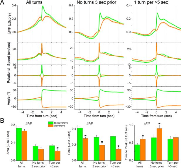 (A) ΔF/F calcium imaging, overall movement, rotational movement, and angle of turning direction for detected movements classified by the turning direction (ipsiversive and contraversive; orange and green) versus the side of the recording (implanted optical fiber). At time zero, the animals spontaneously turn their heads in the indicated direction. The columns show all turns (left), those that included no turn peaks 3 s prior (middle), and peaks selected at a fixed interval >5 s (right). Note that the speed of the movements was similar in both directions (the y-axis speed is truncated to show the rising phase of the movement). (B) Population measures (area of traces 3 s around the detected peaks) of ΔF/F and movement (overall, rotational, and translational) for the different classified peaks. Asterisks denote significant differences (p<0.05) between ipsiversive and contraversive movements. n=8 mice.