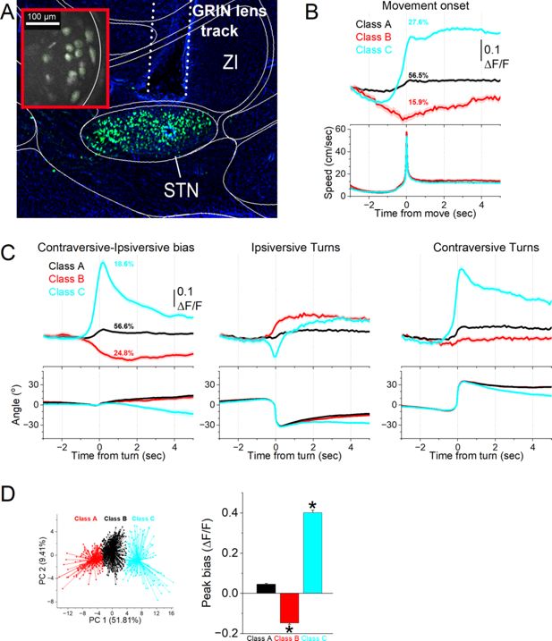 (A) Parasagittal section showing a miniscope GRIN lens tract reaching STN and GCaMP7f fluorescence expressed in STN glutamatergic neurons. The section was aligned with the Allen brain atlas. The red inset shows a FOV of imaged cells during a recording session. ZI, zona incerta; STN, subthalamic nucleus. (B) Classification of STN glutamatergic neurons during spontaneous movement onsets with k-means reveals three classes (mean ± SEM). The top traces show ΔF/F calcium imaging, and the bottom traces show the movement onset. Class A neurons activated weakly during movement onset. Class B neurons were inhibited while Class C neurons activated sharply during movement onset. (C) Classification of STN glutamatergic neurons during spontaneous turning movements with k-means reveals three classes (mean ± SEM). The top traces show ΔF/F calcium imaging, and the bottom traces show angle of turning direction for detected movements separated by class. The left panels show the activation difference (bias) between contraversive-ipsiversive directions used to classify the cells. The middle and right panels show the corresponding contraversive and ipsiversive movements. Class A neurons did not activate during turns and did not code turn direction. Class B neurons showed stronger activation in the ipsiversive direction. Class C neurons activated more strongly than Class B in the contraversive direction. (D) Population comparison of ΔF/F Peak amplitude bias (difference between contraversive-ipsiversive direction) for the three classes of neurons. Asterisks denote significant differences (p<0.05) between both directions. The k-means clusters of the three cell classes from C are shown on the top panel. n=5 mice.