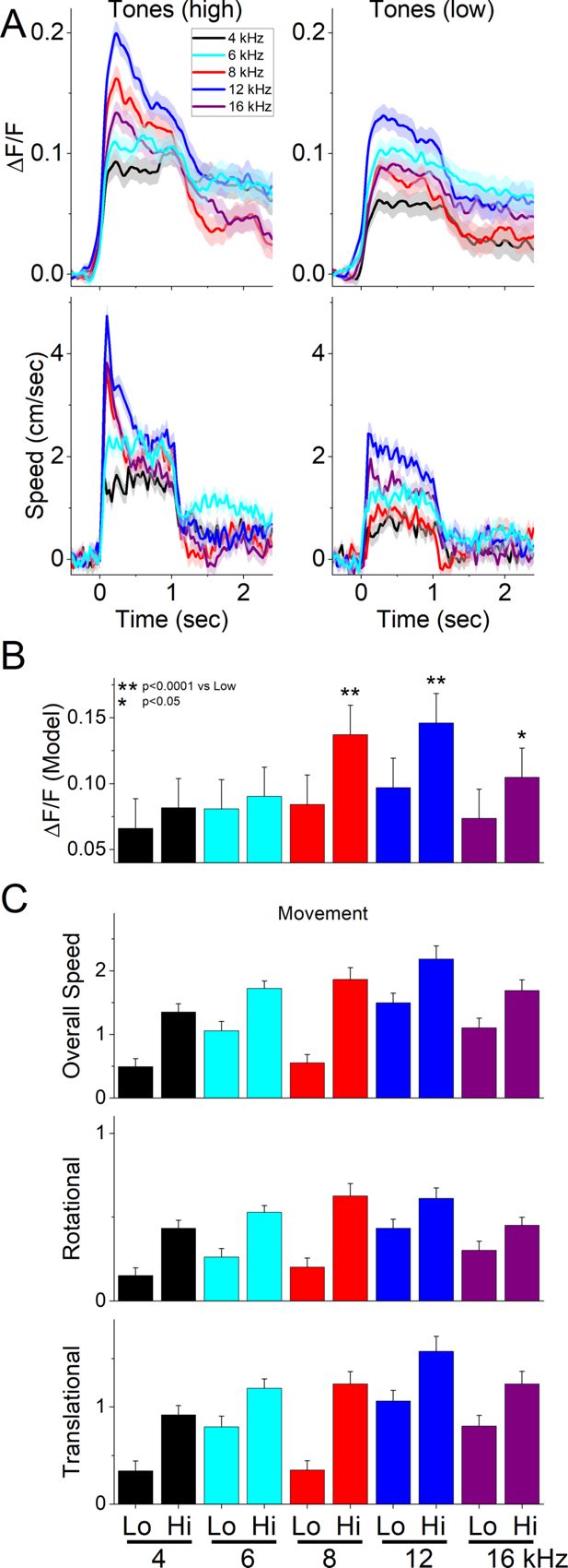 During these sessions (52 sessions in 6 mice; Figure 4), mice were placed in a small cage (half the size of the shuttle box) and presented with 10 auditory tones of varying salience, defined by sound pressure level (low: ~70 dB; high: ~85 dB) and frequency (4, 6, 8, 12, 16 kHz), delivered in pseudorandom order (1 s tones every 4–5 s, each repeated 10 times per session). Tones reliably evoked STN activation as well as movement, with both ΔF/F signals and head speed (overall speed and its rotational and translational components) increasing at higher intensities and frequencies (TwoWayRMAnova, all p<0.001). These effects were modest in amplitude (STN: 0.1–0.2 z-score; movement: 2–4 cm/s) but raised the question of whether neural responses reflected auditory processing, motor activity, or both.