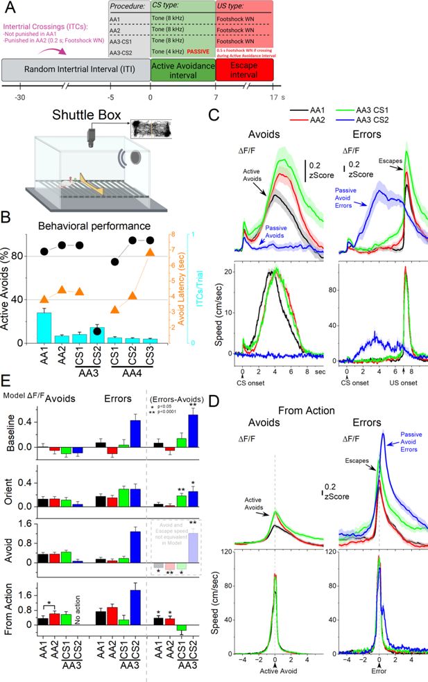 (A) Schematic of the shuttle box and the structure of signaled avoidance trials. Each trial begins at time 0 following a random intertrial interval (ITI). The avoidance interval lasts 7 s and is signaled by a CS (8 kHz tone); shuttling during this window prevents the escape interval (AA1, AA2, AA3-CS1 trials). If the mouse fails to avoid, the escape interval begins and the US (footshock plus white noise) is delivered until escape, which occurs rapidly. AA2 is like AA1, but intertrial crossings (ITCs) are punished (0.2 s US). In AA3, CS1 continues like in AA1/2 (ITCs are no longer punished). In AA3, CS2 trials (4 kHz tone), CS signals passive avoidance: shuttling during CS2 is punished with a brief US (0.5 s). AA4 (not shown) is identical to AA1 but with variable-duration avoidance intervals signaled by three different CSs (CS1-CS3, 8, 4, 12 kHz). (B) Behavioral performance during the four different avoidance procedures (AA1-4) showing the percentage of active avoids (black circles), avoidance latency (orange triangles), and ITCs (cyan bars). In AA3-CS2, active avoids are passive avoid errors. (C) Average ΔF/F and overall movement traces aligned from CS onset for AA1, AA2, and AA3 (CS1 and CS2) procedures for trials classified as avoids (correct active or passive avoids, left) or errors (escapes or passive avoid errors, right) of CS-evoked responses. (D) Same as in C, but aligned from-action occurrence. (E) Marginal means (ΔF/F) from the linear mixed-effect models for the baseline, orienting, avoidance, and from-action windows during AA1, AA2, and AA3 (CS1 and CS2). The right panel shows estimated differences between errors and avoids, with asterisks indicating significance. Transparency in the avoidance window denotes that movement during this window was not controlled (held constant) between avoids and errors in the model. n=6 mice.