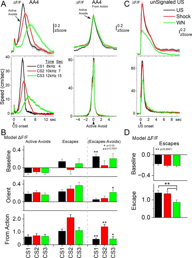 (A) Average ΔF/F and overall movement traces from CS onset (left) and action occurrence (right) for active avoids during the AA4 procedure, which includes three CSs that signal avoidance intervals of different durations. (B) Marginal means (ΔF/F) from the linear mixed-effect models for the baseline, orienting, and from-action windows for the data in A. The right panel shows estimated differences between escapes. and active avoids, with asterisks indicating significance. (C) Average ΔF/F and overall movement traces from US onset for escapes during the unsignaled US procedure, which includes the US, or each of its components delivered alone (foot-shock and white noise). (D) Marginal means (ΔF/F) from the linear mixed-effect models for the baseline and escape windows for the data in C. n=7 mice.