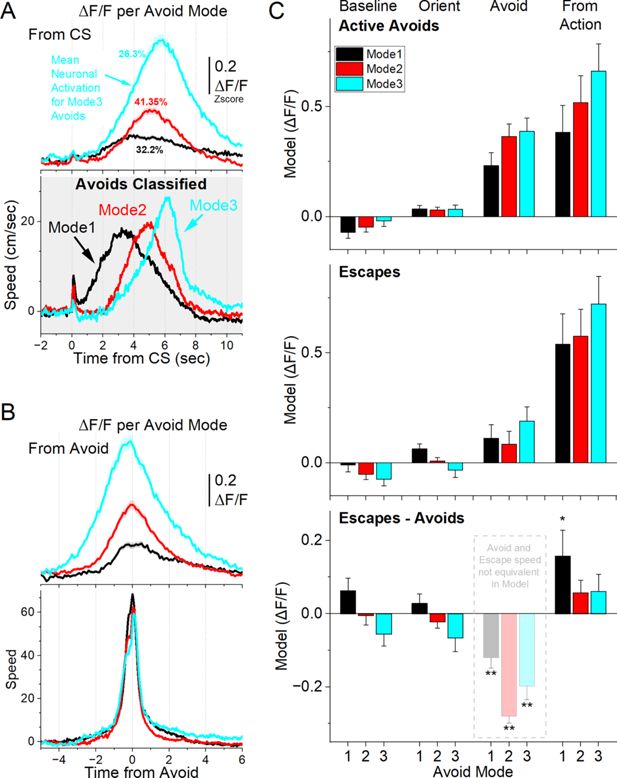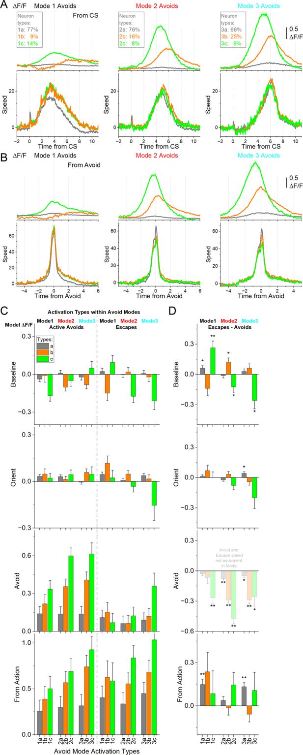 The preceding analysis combined neuronal activity within each avoidance mode, but this could mask functional diversity among subpopulations. To address this, we applied k-means clustering to the ΔF/F time series of individual neurons, which revealed three distinct activation types during each avoidance mode (Figure 9A and B). Importantly, neuronal activation types are defined independently within each mode and are not assumed to overlap across modes. Thus, comparisons between modes do not reflect comparisons of the same neurons. In Mode 1 avoids, Type 1 a (gray) neurons showed no activation, Type 1b (orange) neurons were inhibited at CS onset before activating during the avoidance response, and Type 1 c (green) neurons activated during the avoidance response (Tukey q=14.88, p<0.0001, 1 c vs. 1 a; q=8.4, p<0.0001, 1 c vs. 1b). In Mode 2 avoids, Type 2 a neurons showed no activation, Type 2b neurons activated during avoidance responses, and Type 2 c neurons activated in advance of the response (Tukey q=25.39, p<0.0001, 2b vs. 2 a; q=37.55, p<0.0001, 2 c vs. 2 a; q=16.96, p<0.0001, 2 c vs. 2b). Mode 3 avoids exhibiting similar patterns to Mode 2. Type 3 a neurons showed minimal activation, Type 3b neurons activated near the time of movement, and Type 3 c neurons activated prior to the avoidance response (Tukey q=33.49, p<0.0001, 3b vs. 3 a; q=41.43, p<0.0001, 3 c vs. 3 a; q=18.77, p<0.0001, 3 c vs. 3b).