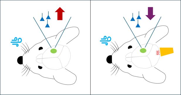 Left panel: When puffs of air (pale blue) are used to stimulate the whiskers of mice in a way that mimics what happens when mice use their whiskers to navigate, there is an increase (red arrow) in the activity of the pyramidal neurons (dark blue) in the somatosensory cortex (green), which induces experience-dependent plasticity. Right panel: However, when optogenetic techniques are used to stimulate climbing fibers (bright red) in the cerebellum at the same time as the whiskers are being stimulated, there is no increase in the activity of the neurons in the somatosensory cortex, and hence experience-dependent plasticity is blocked (purple arrow). To stimulate the climbing fibers, Silbaugh et al. used brief laser pulses (orange) to trigger a light-sensitive protein called channelrhodopsin that had been introduced into the fibers.