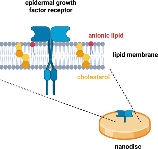 The complexity of the plasma membrane has, in the past, made it difficult for researchers to dissect its contribution to EGFR signalling. To overcome this, Srinivasan et al. performed their experiments on nanodiscs – small circles made of lipid membrane that resemble the plasma membrane of a cell (Denisov and Sligar, 2016). These nanodiscs were notable for two reasons: first, a full-length EGF receptor protein was embedded in the nanodisc; second, Srinivasan et al. were able to vary the lipid content of the nanodiscs, and then observe how this influenced the response of the receptors.