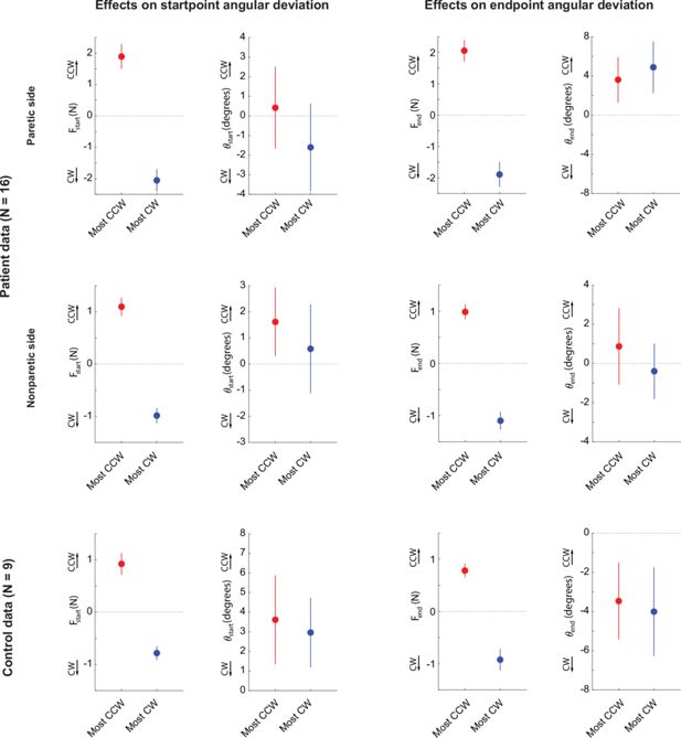 (A) Reproduction of Figure 5E (right) and Figure 5F (right) for reference (data from the paretic side of stroke patients). Left: resting biases corresponding to the instances (target directions) where the component of the resting bias lateral to the target direction was the most CW (blue) vs. the most CCW-oriented (red). Right: corresponding initial angular deviations. (B) Same analyses for the non-paretic arm of stroke patients. (C) Same analyses for the control data.