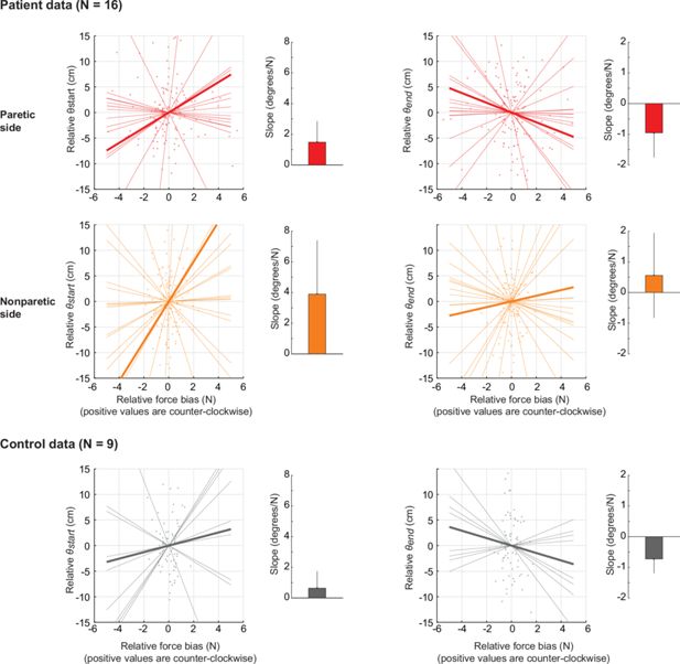 This analysis, in contrast to the main analysis in Figure 5E/F which only compares the instances where resting biases are the most CW/CCW related to movement direction, takes all possible instances and uses linear regression to estimate the sensitivity (slope) of initial and endpoint angular deviations to resting biases on the start and target positions, respectively. (A) Analysis for the patients’ paretic arm. Left: Shown is a scatter plot of the relative (i.e. mean-subtracted) initial angular deviation (θstart, y-axis) against the relative force bias lateral to movement (Fstart, x-axis). Each dot represents one movement direction for one participant. Both x- and y-axis data were mean-subtracted separately for each participant. The thin lines indicate linear fits for each participant; the thick line indicates the average of those fits. The bar graph to the right shows the average slope (sensitivity)± SEM. Positive slopes indicate that angular deviations follow the posture bias at start; there is no evidence of a positive slope as shown in the bar graph, in line with our main analysis in Figure 5F. Right: same but for endpoint angular deviations (θend) against resting biases at the target (Fend). (B) and (C) Same as in (A) but for the non-paretic arm of patients and for healthy controls, respectively.