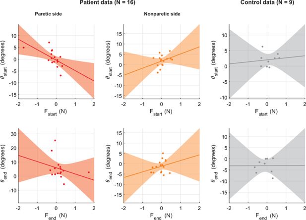 (A) Scatter plot of average θstart the average component of Fstart lateral to target direction. Positive numbers indicate counter-clockwise θstart and Fstart. Solid line indicates linear fit; shading illustrates the associated 95% confidence interval. Plots indicate a lack of positive relationship. While this is in line with the main analysis, these across-individual relationships can only provide limited evidence since they may average out opposing contributions of resting biases. This is why our main analysis focuses on within-individual differences across different movement directions. (B, C) Same as (A) but for the non-paretic side of patients (B) and for healthy controls (C). (D–F) Same as (A–C) but for approach angle close to the endpoint, θend.