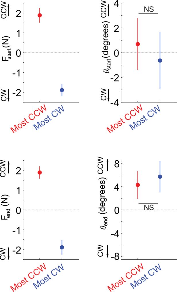 Repetition of the analysis in Figure 5E/F (top) and 5 H/I (bottom) but with resting biases calculated without trial rejection, showing similar results (lack of relationship between θstart and θend with Fstart and Fend, respectively).
