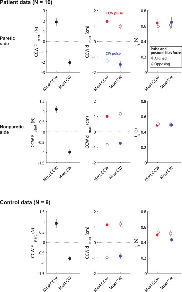 Top row: Reproduction of Figure 6D for reference (data from the paretic side of stroke patients). Middle row: Same analyses for the non-paretic arm of stroke patients. Bottom row: Same analyses for the control data. Note, in all cases, the lack of difference between the instances where postural biases were the most aligned vs. the most opposed to the pulse.