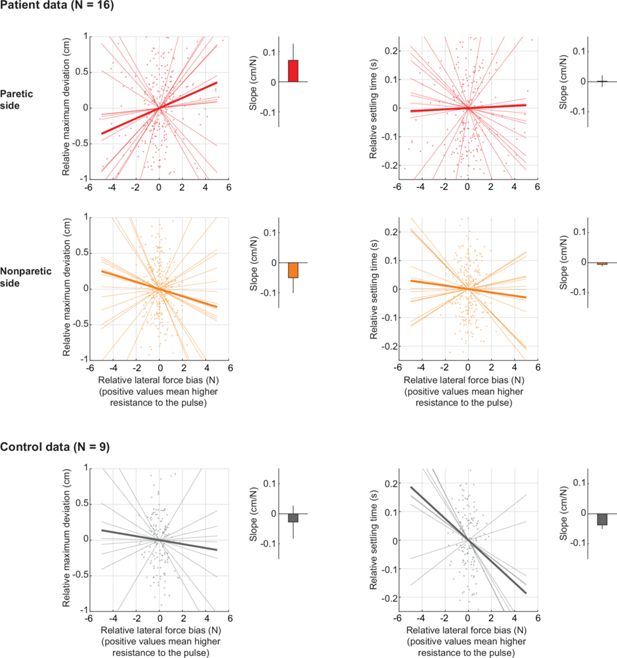 This analysis, in contrast to the main analysis in Figure 6D which only compares the instances where resting biases are the most aligned vs. the most opposed to the pulse perturbations, takes all possible instances and uses linear regression to estimate the sensitivity (slope) of maximum deviation to resting biases. (Top row) Analysis for the patients’ paretic arm. Left: Shown is a scatter plot of the relative (i.e. mean-subtracted) maximum deviation (y-axis) against the relative force bias in the perturbation direction (x-axis), with positive values indicating increased resistance to the pulse. Each dot indicates one movement direction/pulse sign combination for one participant. Both x- and y-axis data were mean-subtracted separately for each participant and pulse type. The thin lines indicate linear fits for each participant; the thick line indicates the average of those fits. The bar graph shows the average slope (sensitivity)± SEM. Negative slopes indicate interaction with responses to perturbations during active movement. There is no evidence of a negative slope as shown in the bar graph, in line with our main analysis in Figure 6D. Right: Same as left, but for the relative settling time. (Middle row) and (Bottom row) Same as in (A) but for the non-paretic arm of patients and for healthy controls, respectively.