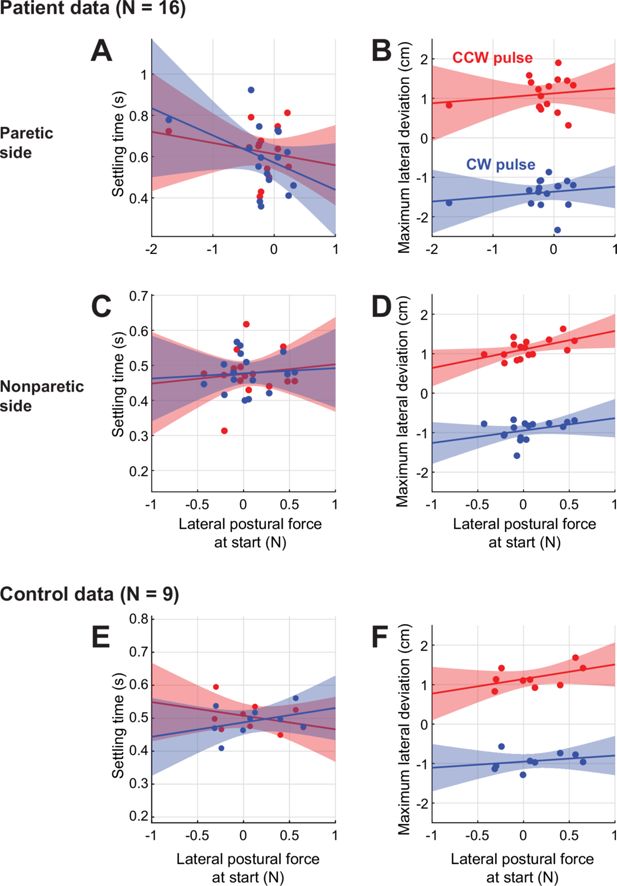 (A) Across-patient comparison between settling time and lateral postural bias forces on movement start. Paretic data shown. Red: CCW pulse; Blue: CW pulse. (B) Same as (A), but for (signed) maximum lateral deviation for the two pulse types. (C,D) Same as (A,B) but for nonparetic data. (E,F) Same as (A,B) but for control data.