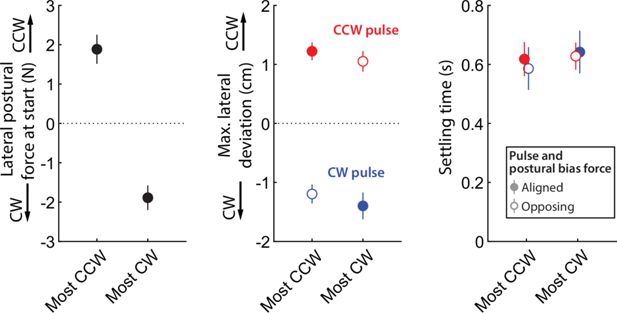 (A) Examples of perturbed (red: perturbed with CCW pulse; blue: perturbed with CW pulse) and unperturbed (gray) outward trajectories - same individuals as in Figure 3B. (B) Lateral velocity (positive: CCW to movement) before and after pulse onset, and corresponding responses from controls (gray), illustrating how patients, in response to the pulse, take longer time to settle and tend to experience larger lateral deviations compared to controls. (C) Summary performance measures for patients and controls, indicating impaired performance with the paretic side: settling time (left) and maximum lateral deviation on pulse direction (right). (D) Within-individual analysis: here, for each individual, we selected the movements for which the starting-position resting postural force would be either the strongest CCW or CW (left); we then examined the corresponding settling time (middle) and maximum lateral deviations (right). We find no effects of the most CCW vs. most CW resting postural forces in either case: there is no evidence for either reduced settling time or increased maximum lateral deviation for instances where pulse and resting bias are most opposing (open circles) compared to the instances where pulse and resting bias are most aligned (filled circles). Error bars indicate SEM; data from n=16 stroke patients and n=9 healthy control participants.