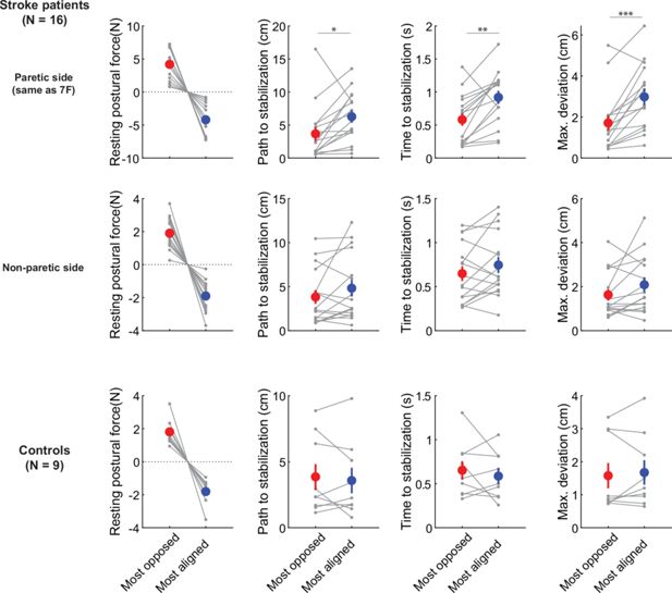 Top row: Reproduction of Figure 7F for reference (data from the paretic side of stroke patients). Middle row: Same analyses for the non-paretic arm of stroke patients. Note that, while the magnitude of the corresponding resting biases is lower compared to the paretic arm, the outcome variables (path to stabilization, time to stabilization, and maximum deviation) are nominally (but not significantly) lower in the case where resting biases are most opposed to the perturbation. Bottom row: Same analyses for the control data.