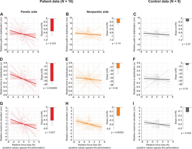 This analysis, in contrast to the main analysis in Figure 7F which only compares the instances where resting biases are the most aligned vs. the most opposed to the static release perturbation, takes all possible instances and uses linear regression to estimate the sensitivity (slope) of the outcome variables to resting biases. (A) Analysis for the patients’ paretic arm. Shown is a scatter plot of the relative (i.e. mean-subtracted) path to stabilization (y-axis) against the relative force bias in the perturbation direction (x-axis). Both x- and y-axis data were mean-subtracted separately for each participant. The thin lines indicate linear fits for each participant; the thick line indicates the average of those fits. The bar graph to the right shows the average slope (sensitivity)± SEM, which was, in this case, significantly negative in line with an effect of resting bias on patients’ performance against the holding perturbation. (B) and (C) Same as in (A) but for the non-paretic arm of patients and for healthy controls, respectively. (D–F) Same as A-C but for relative time to stabilization. (G–I) Same as A-C but for relative maximum deviation. Note how all three metrics demonstrate that patients are more able to resist and recover from the static release perturbation when resting biases are directed against the perturbation (A,D,G). In turn, this supports the evidence shown in Figure 7F that resting biases interact with active holding control.