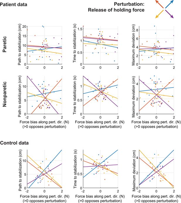 Different colors indicate data related to the four different release perturbation directions. Lines indicate linear fits. Positive values in the x-axis indicate biases that would oppose the perturbation. Note the limitations of these inter-individual analyses (which also hold for Figure 5—figure supplement 3, Figure 6—figure supplement 3): First, averaging these effects for each individual would average out opposing contributions of resting biases; here, because the perturbations come in exactly opposing pairs, this would average to zero, which is why we show these relationships for each perturbation separately instead (which may result in higher measurement noise). Second, the power of correlation analyses may be diluted by inter-individual differences in other factors, such as overall stiffness. Focusing on within-individual differences addresses both these issues.