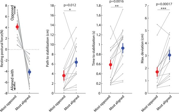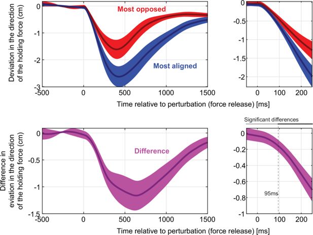 Top: deviation in the direction of the holding force for the cases where the resting bias was the most aligned (blue) vs. the most opposed (right) to the perturbation. The right panel zooms in the first 250ms following the release. Bottom: difference between the most-opposed vs. most-aligned data shown on top. On the right panel, statistically significant differences emerge 95ms after the release.