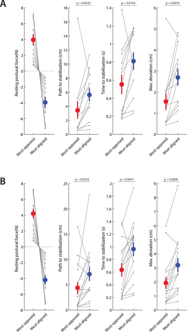 Repetition of the analysis in Figure 7F but with resting biases calculated without trial rejection, showing similar results (performance against the static release perturbation is better when the resting biases are directed against the perturbation, and worse when the resting biases are aligned with the perturbation, showing interaction between resting biases and active holding control).