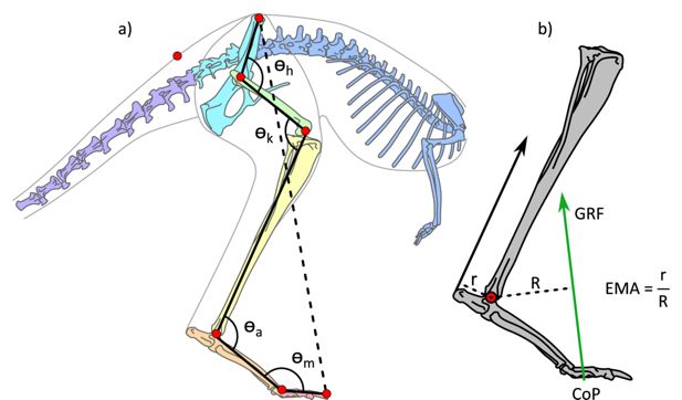 In this study, we investigated the hindlimb kinematics and kinetics in kangaroos hopping at various speeds. Specifically, we explored the relationship between changes in posture, EMA, joint work, and tendon stress across a range of hopping speeds and body masses. To do this, we built a musculoskeletal model of a kangaroo based on empirical imaging and dissection data (Figure 1a). We used the musculoskeletal model to calculate ankle EMA throughout the stride by capturing changes in both muscle moment arm and the GRF moment arm, allowing us to explore their individual contributions. We hypothesised that (i) the hindlimb would be more crouched at faster speeds, primarily due to the distal hindlimb joints (ankle and metatarsophalangeal), independent of changes with body mass, and (ii) changes in moment arms resulting from the change in posture would contribute to the increase in tendon stress with speed, and may thereby contribute to energetic savings by increasing the amount of positive and negative work done by the ankle without requiring additional muscle work.
