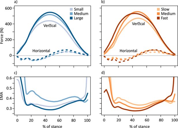 In (a) and (b), the medial-lateral component of the GRF is not shown as it remained close to zero, as expected for animals moving in a straight-line path. Lower panels show average time-varying effective mechanical advantage (EMA) for the ankle joint subset by (c) body mass and (d) speed.