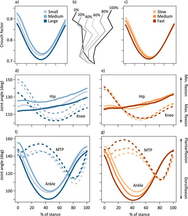 In addition to, and independent of, the change in posture with mass, there were substantial postural changes due to speed (Appendix 1—table 3). Unlike with mass, speed-related changes occurred predominantly during the braking phase, and the changes were concentrated in the ankle and MTP joints, with little to no change in the proximal joints (Figure 3c, e and g; Appendix 1—table 3). There was a significant decrease in ankle plantarflexion at initial ground contact and increase in dorsiflexion at midstance at faster speeds (Figure 3g; Appendix 1—table 3). Maximum ankle dorsiflexion occurred at 44.8±4.5% of stance, and tended to occur 3.9±0.7% earlier in stance with each 1 ms–1 increase in speed (p<0.001). MTP range of motion increased with speed due to an increase in MTP plantarflexion prior to midstance rather than a change in dorsiflexion (Figure 3g).